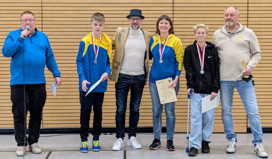 Im Rahmen eines Vereinsturnieres für alle Jahrgänge in der Stadthalle Falkensee gab es eine Sportler-/Helferehrung durch unseren Bürgermeister, Heiko Richter. Ob auf oder neben dem Platz – immer im „Dienste“ für unsere blau-gelben jungen oder älteren Sportler. Hierfür wurden geehrt: Tanja & Beate (nicht auf dem Bild), Volker, Erik & Pepe.