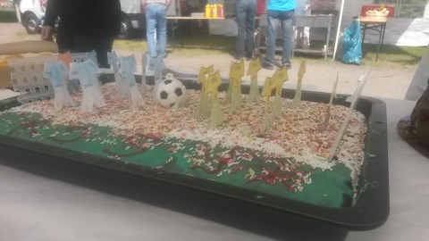 Das kann man sich schmecken lassen – eine Torte für die ‚Frauen Spielgemeinschaft Falkensee', ein Zusammenschluss der Mädchen- und Frauenmannschaften der Sportvereine SV Blau-Gelb Falkensee und SV Falkensee-Finkenkrug. Unsere C-Juniorinnen haben diese hübsche Torte für das Kuchenbuffet am „Tag des Mädchenfußballs" am 1. Mai gebacken und gezeigt, dass sie nicht nur auf dem Spielfeld ein tolles Team sind.