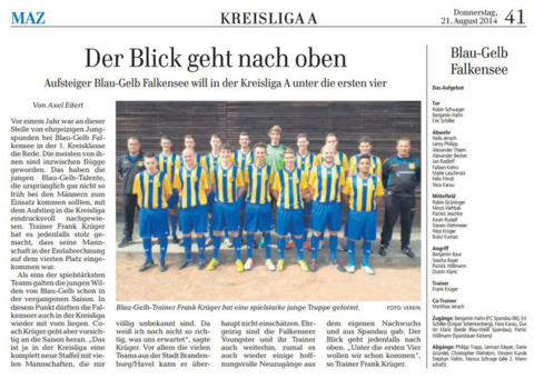Kreisoberliga Havelland: Coach Frank Krüger hört nach der Saison endgültig auf. Eigentlich wollte Frank Krüger schon vor einem Jahr nach dem Aufstieg in die Fußball-Kreisoberliga bei Blau-Gelb Falkensee als Trainer aufhören. Doch nach einem schwachen Saisonstart von seinen damaligen Nachfolgern wurde er vom Verein schon nach kurzer Zeit wieder zurückgeholt. Nach dieser Saison soll aber endgültig Schluss sein. Auf der Suche nach einem Nachfolger für die kommende Spielzeit ist Blau-Gelb Falkensee nun fündig geworden. Dirk Hein wird der neue Trainer beim Kreisoberligisten in der Gartenstadt..."Auszug - hier geht es zum kompletten Artikel - Sportbuzzer Axel Eifert 23.05.2016