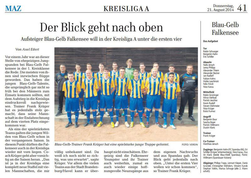 Am 16.05.2014 war das Sat.1 Frühstückfernsehen in Falkensee auf dem Sportplatz Straße der Einheit bei Blau-Gelb Falkensee zu Gast und hat einen Kurzfilm gedreht.