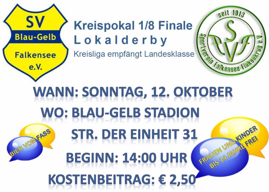 Am Dienstag (18.11.2014) um 18:30 Uhr kommt es zum Aufeinandertreffen der A-Junioren von der SG Blau-Gelb Falkensee/Perwenitz und vom SV Falkensee-Finkengrug im AOK Landespokal Achtelfinale. Die "Gastgeber" spielen in der Landesklasse Nord/West (Tabellenplatz 6 nach 6 Spieltagen) und die "Gäste" vom SVFF spielen in der Brandenburgliga und stehen momentan nach 8 Spieltagen auf dem 10. Tabellenplatz. Gespielt wird auf der Sportanlage Rosenstraße (Rasenplatz).